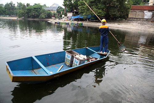 Trưa cùng ngày, Công ty Môi trường đô thị cũng đã huy động 2 xuồng cùng nhiều công nhân thực hiện công tác vớt cá chết nổi trên mặt hồ Thiền Quang.